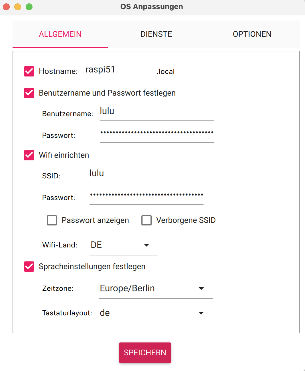 4. Im Raspberry Pi Imager Tool können zusätzlich im „Advanced Options menu“ Einstellungen durchführt werden, die ansonsten später etwas mühsam zu konfigurieren sind.
